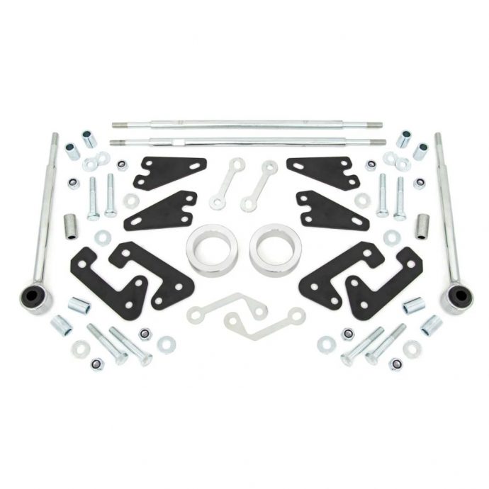 This kit also includes a set of extended sway links and bracket spacer sleeves to keep everything at the optimum angle after lifting. Includes a Lifetime Replacement Guarantee!