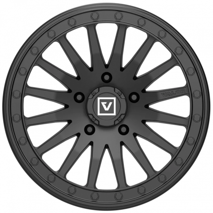 VO6 (5 Lug). We specifically developed the V06 to deliver at the highest level of performance for the Polaris RZR 5-Lug platform. The V06 is a 15x8 +40mm UTV only wheel with a beefy 1250 lb. load rating. The V06 wheel is manufactured using only A356 aluminium with T6 heat treatment for one super strong wheel. Forged 6061 aluminium beadlock ring. Off-road inspired and reinforced inner lip. Engineered to exceed SAE 2530 safety specifications. Bolt-on shorty cap with embossed black logo.