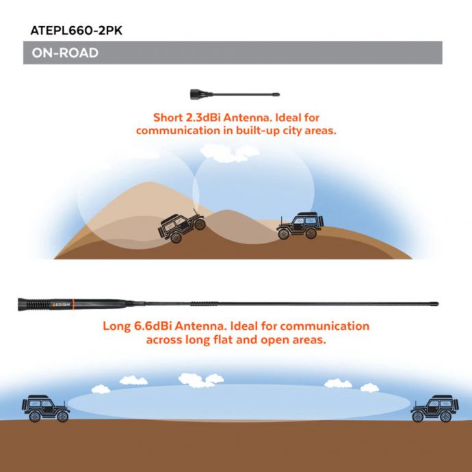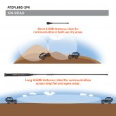 - 6dBi Higher Gain Antenna for Longer Flatter Pattern Operation. Suitable for On-road long flat areas.
