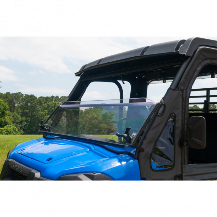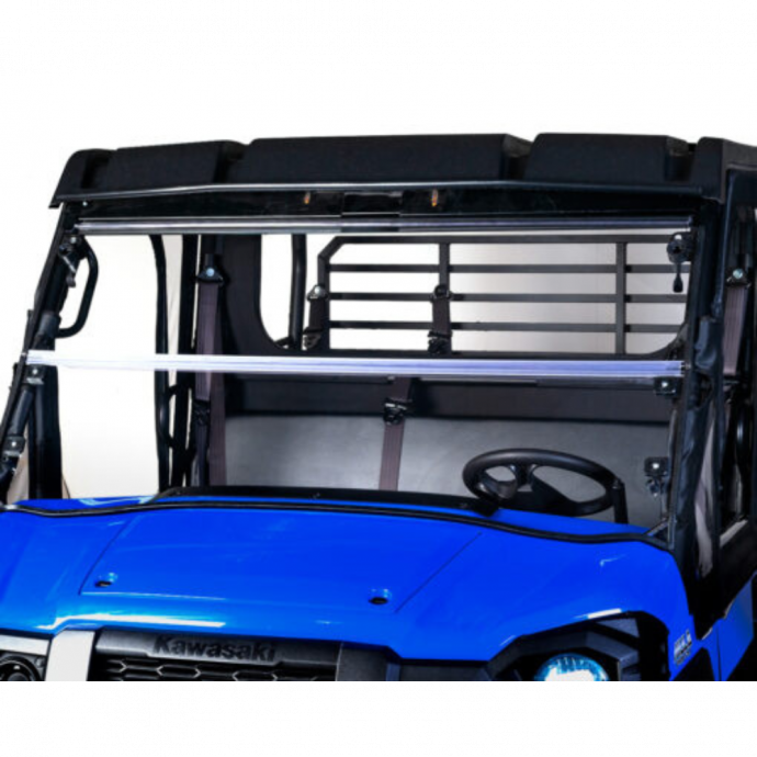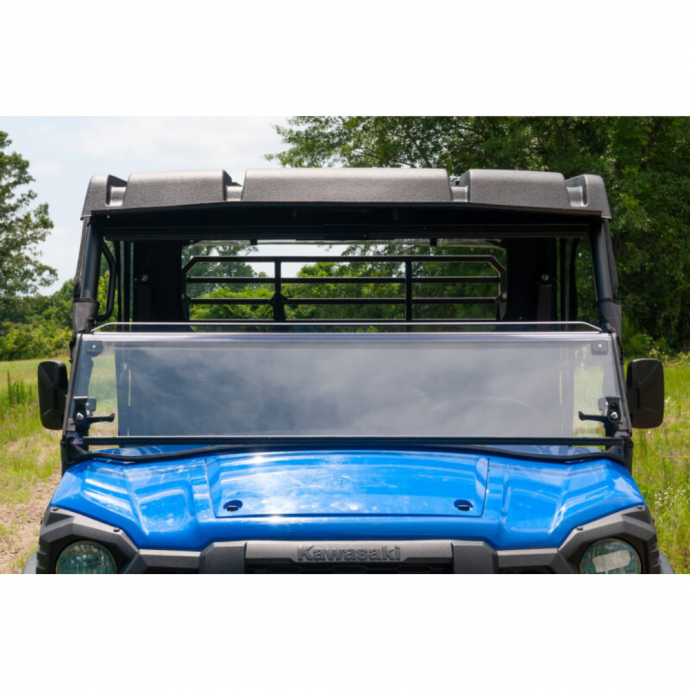 The Seizmik Versa-Fold Windshield quickly converts from a full to half (folded) windshield with a quick flip of two composite levers. When folded, the top windshield is held secure with 2 heavy duty captive rubber plugs. The UV protected, durable and replaceable clear hinge acts as a stiffening rib to help keep the windshield from flexing. Works with both Kawasaki Mule Pro FX and FXT models (however does not fit FXR models).