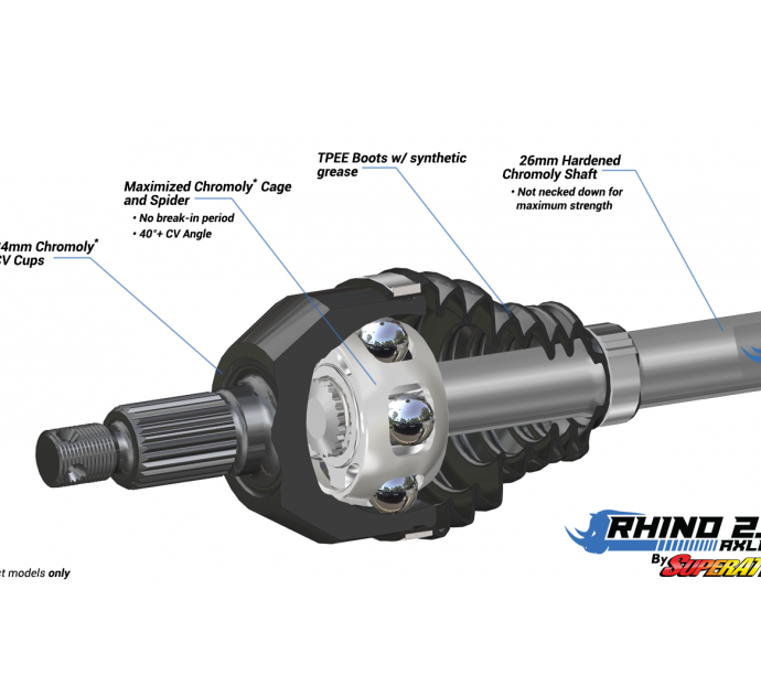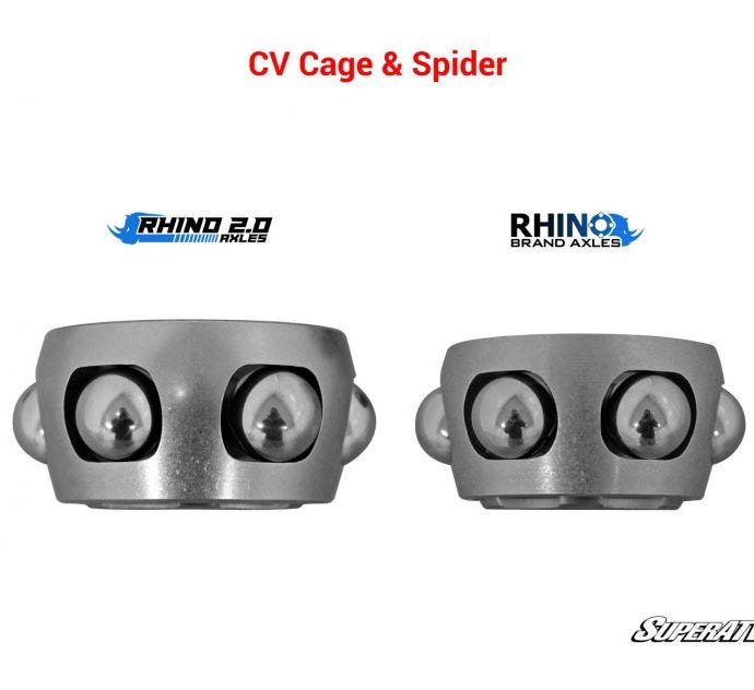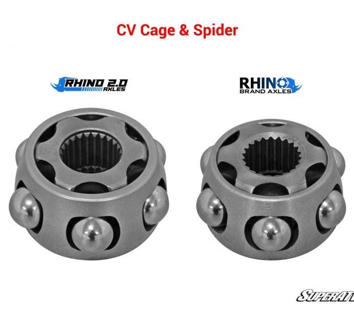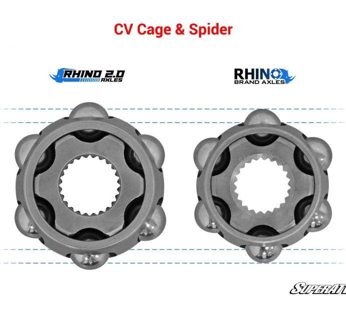 Rhino 2.0 Axles are made from 4340 chromoly steel that’s been hardened using our proprietary heat-treating process to give it more strength and a longer life without fatigue. The best part of these SuperATV axles is the bigger shaft, larger CVs, and maximized cage and spider. That means your CV joints are nearly indestructible and can turn without binding or overheating at 40°+ angles.