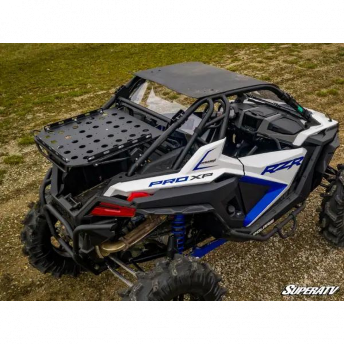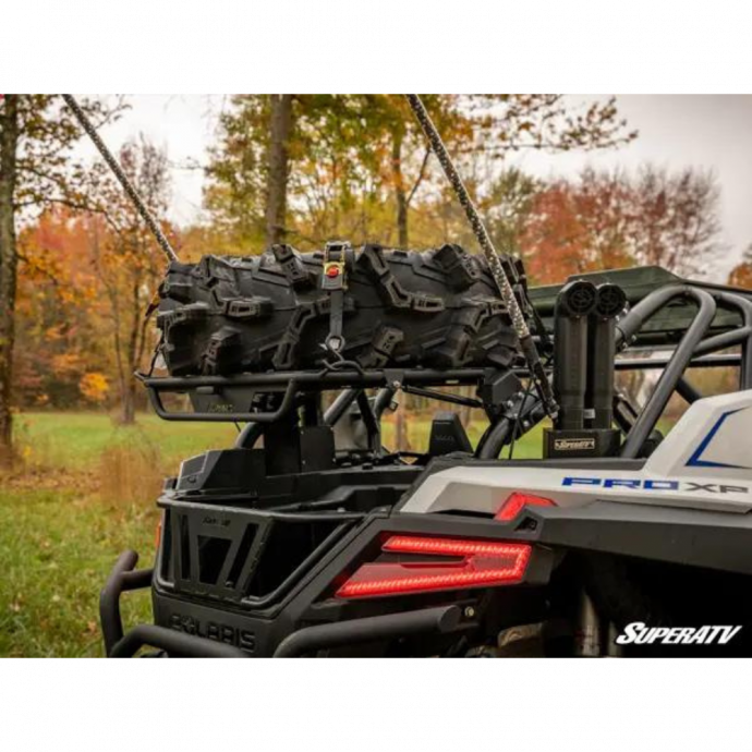 SuperATV, is all about smart storage solutions designed to make your UTV ride better and your life easier. Exhibit A is the Cargo Rack Alpha for the Polaris RZR PRO XP. It attaches to your frame using heavy-duty clamps and, unlike other UTV cargo racks, it's not stationary once installed. This rack utilises gas struts that let you raise and lower it with the turn of a handle so no matter what you're hauling — even something as big as a spare tyre — you've got easy access to the bed below.